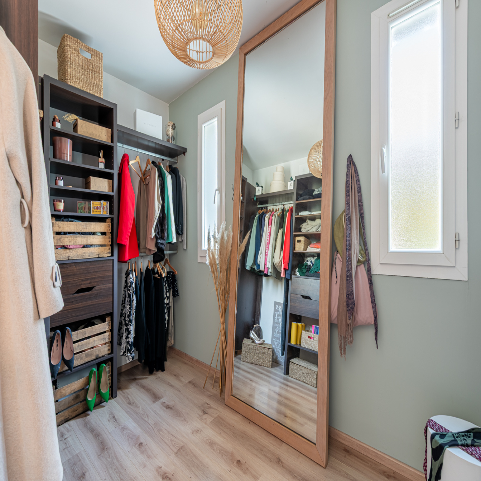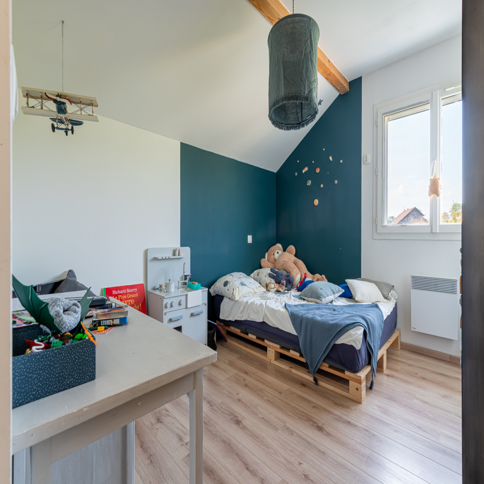 Le système de chauffage est triple : il y a un chauffage électrique au sol, une pompe à chaleur air/air réversible et un insert bois.