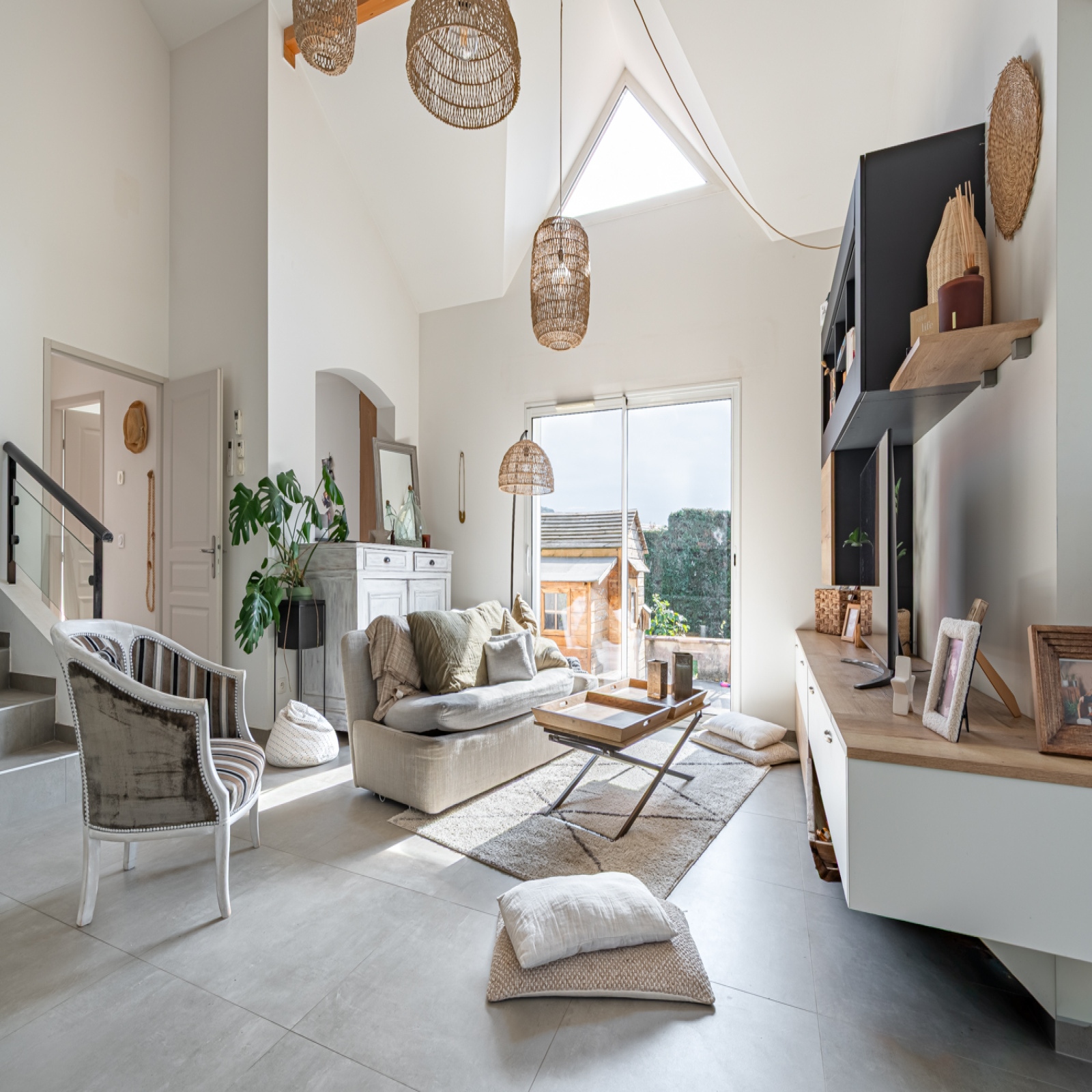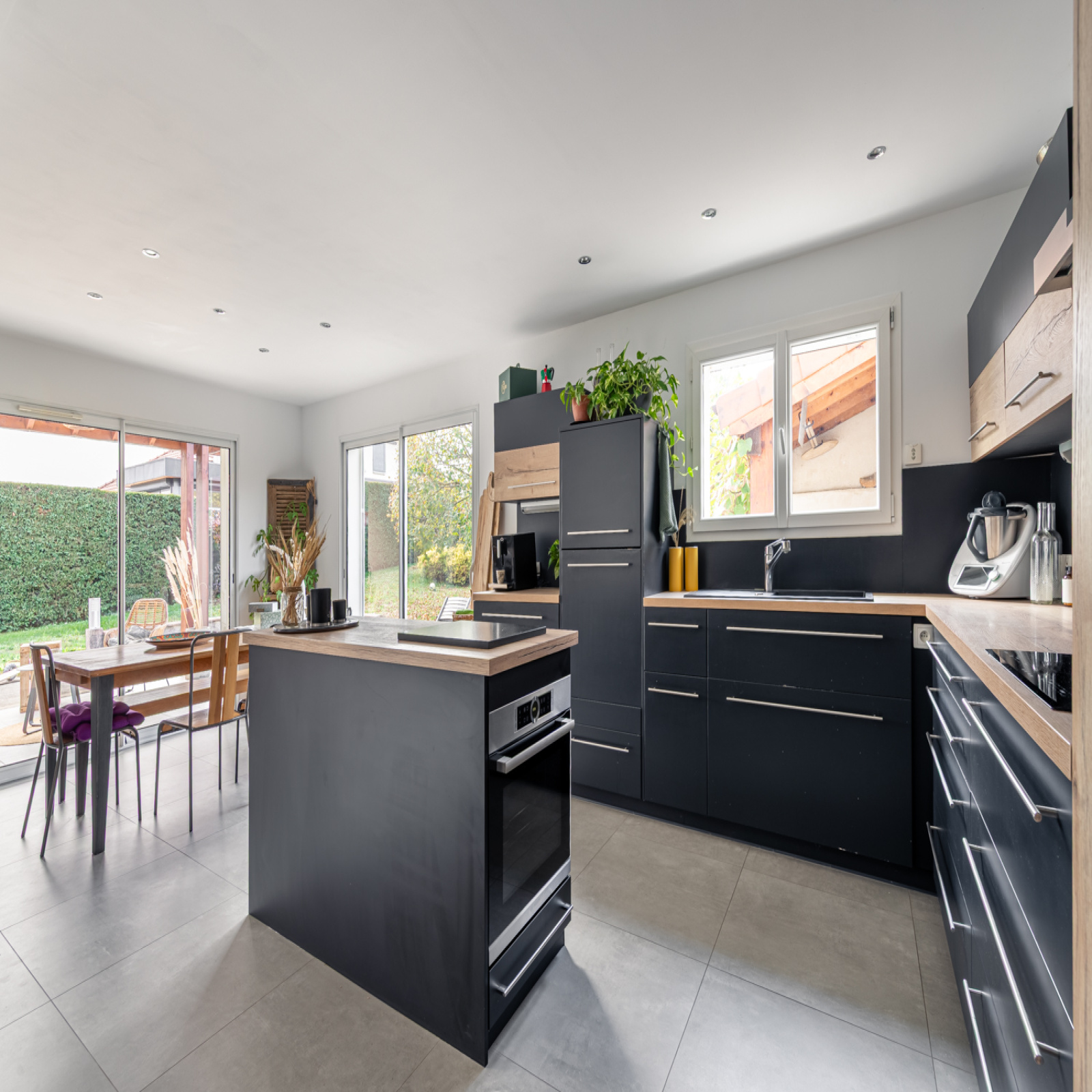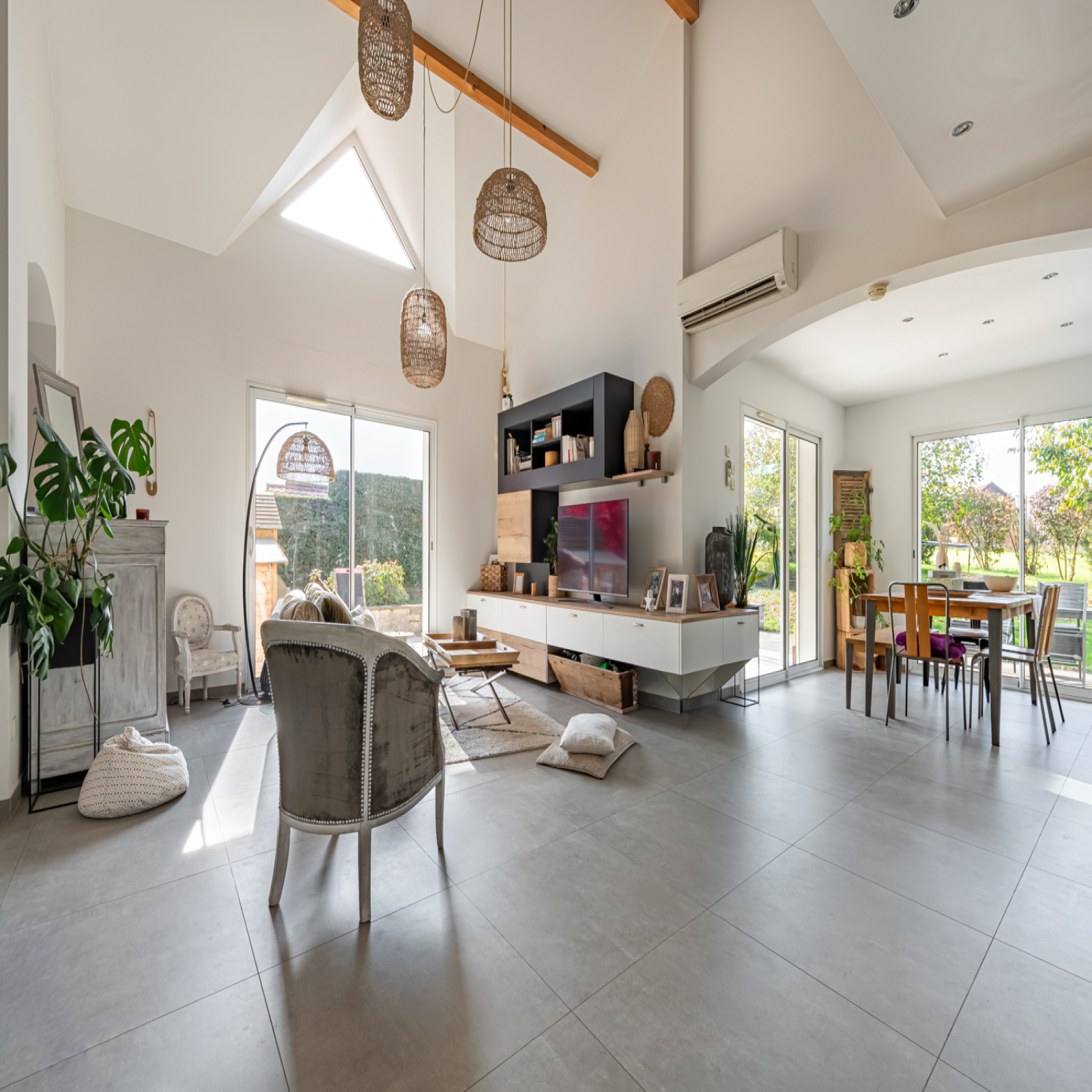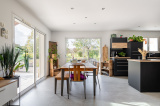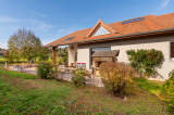 Batie sur un grand terrain de 1110 m², elle a l'avantage d'avoir la terrasse et le jardin en accès direct depuis la pièce de vie.